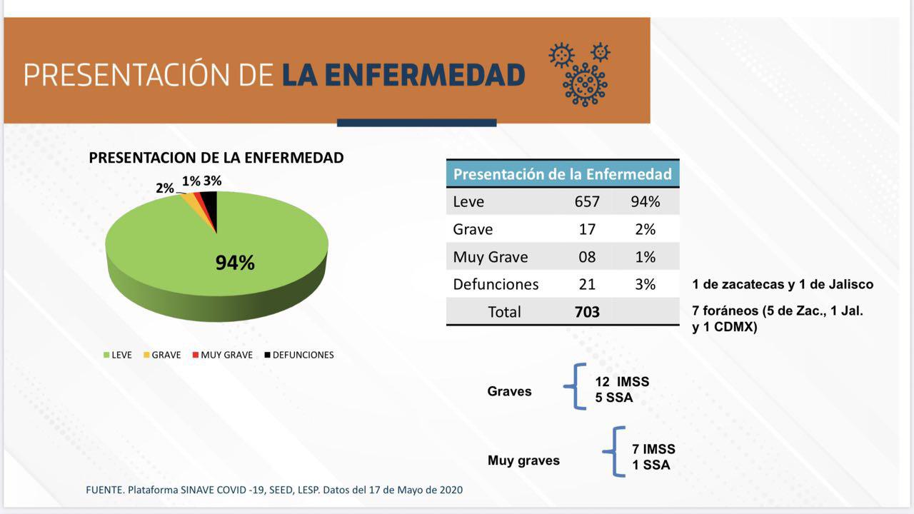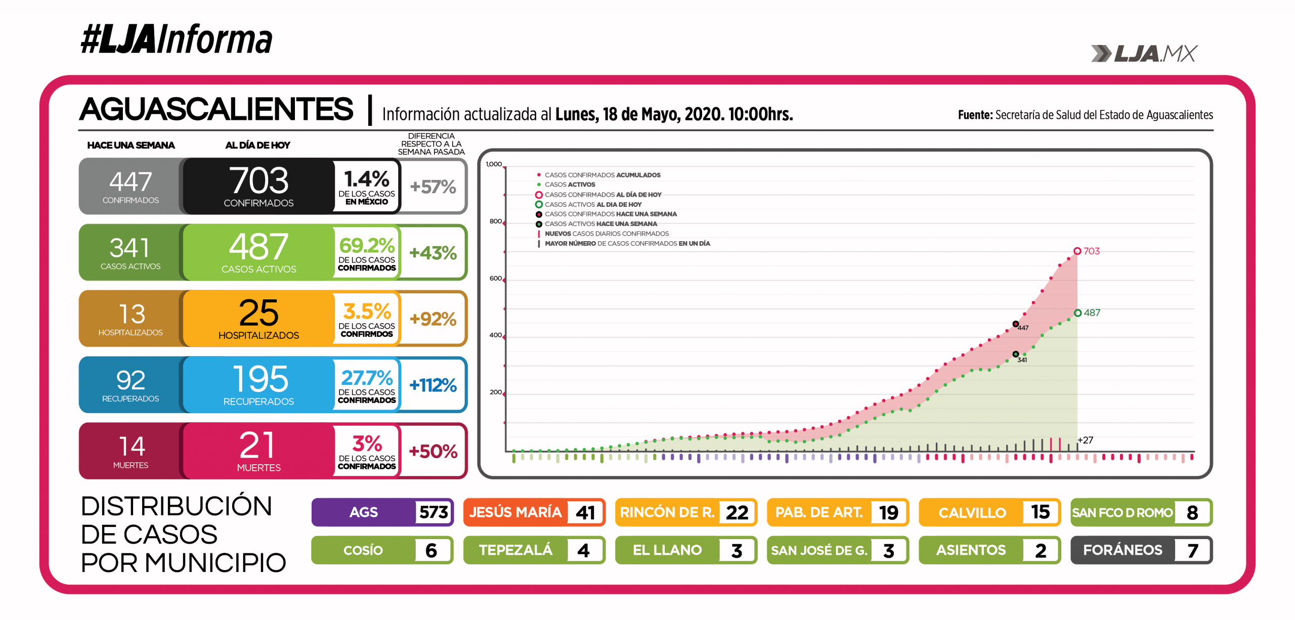 De los 703 casos confirmados acumulados en Aguascalientes, cerca del 70% se reporta como caso activo por la Secretaria de Salud del estado, es decir, hasta el momento en la entidad hay 487 personas infectadas y potencialmente contagiosas.