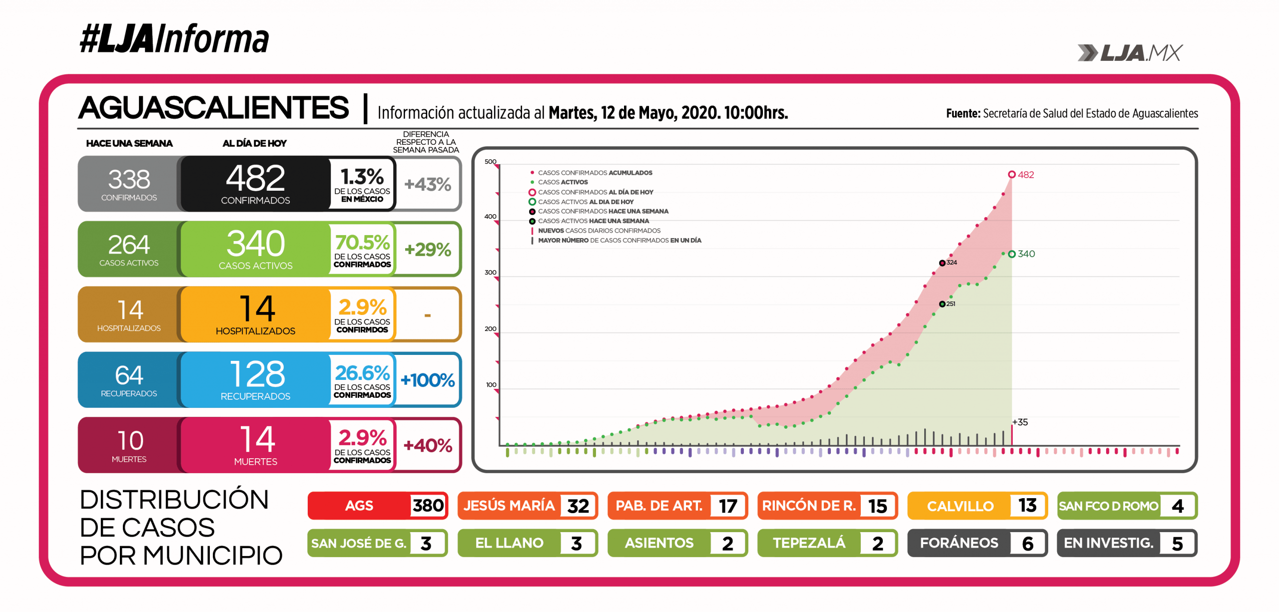 El día de hoy Aguascalientes superó la cifra del mayor número de casos de contagio de #Covid19 registrados en un solo día con 35 nuevos pacientes infectados con SARS-Cov2, estos podrían ser los primeros contagios realizados cerca del 30 de abril.