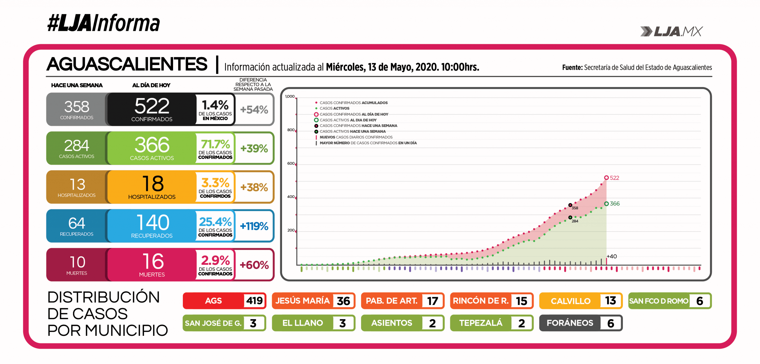 Hoy Aguascalientes ha superado por segundo día consecutivo su cifra de casos máximos en un sólo día con [mark]40 nuevos pacientes de Covid-19[/mark], para darnos un total de 522 contagios por SARS-Cov2 en la entidad, siendo la capital del país quien concentra el 80% de los casos, equivalente a 419 infectados, seguido por Jesús María con 36; Pabellón de Arteaga con 17, Rincón de Romos con 15; Calvillo con 13; Rincón de Romos con 6; San José de Gracia y El Llano con 3; Asientos y Tepezalá con 2; y 6 pacientes que la Secretaría de Salud denomina como “foráneos” provenientes de Zacatecas (4), Jalisco (1) y CDMX (1).
