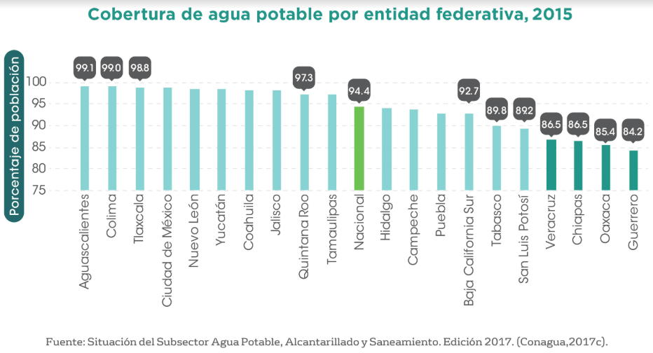- Tiene una cobertura del 99.1.% del servicio de agua potable y 93.7% de suministro diario en los hogares, según cifras del Inegi y Coneval