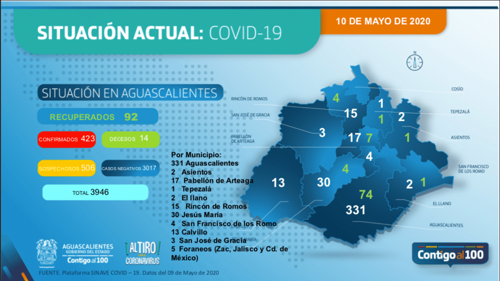 Hoy Aguascalientes confirmó nuevos casos de contagio por COVID-19 aumentando la cantidad en más de un 4% al ser ya 423 casos. Hasta el día de hoy, 10 de mayo del 2020 a las 11:20am se mantiene el número de decesos manteniendo las 14 muertes provocadas por esta enfermedad. El día de ayer el último deceso se trató de una mujer de 78 años, atendida en la clínica 1 del IMSS que presentaba diabetes e insuficiencia respiratoria crónica.