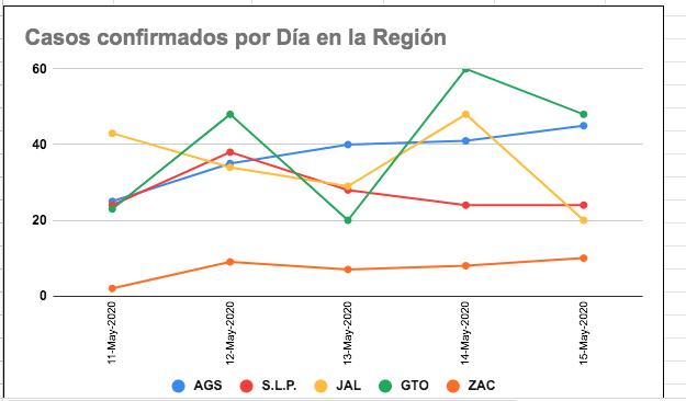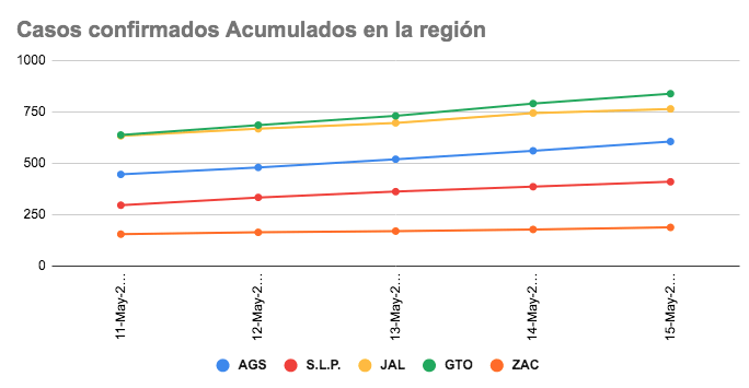 Al 15 de mayo, Aguascalientes tiene 608 casos confirmados, San Luis Potosí 412, en Jalisco son 767, Guanajuato lleva el liderazgo con 841 y Zacatecas es el estado con menos al sumar 190.
