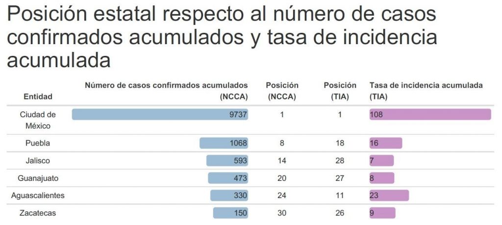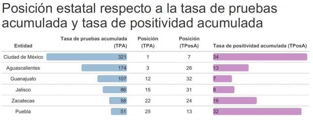 Aguascalientes es la tercera entidad en el número de pruebas aplicadas ajustadas por el tamaño de la población, pero su posición en cuanto al porcentaje de pruebas que son positivas es la 26.
