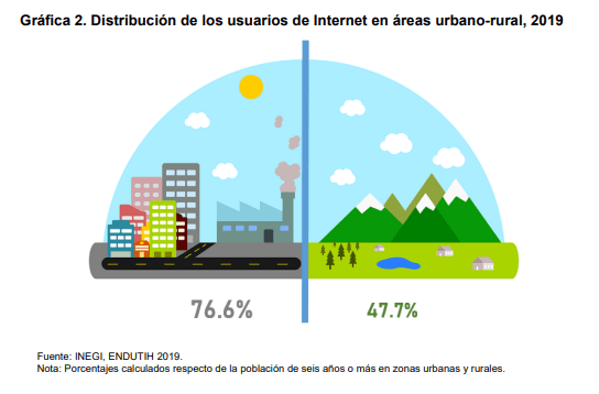 La relación de acceso a Internet por zona urbano-rural presenta una diferencia de 28.9 puntos porcentuales, ya que los resultados reflejan un 76.6% en las zonas urbanas y 47.7% en las rurales.