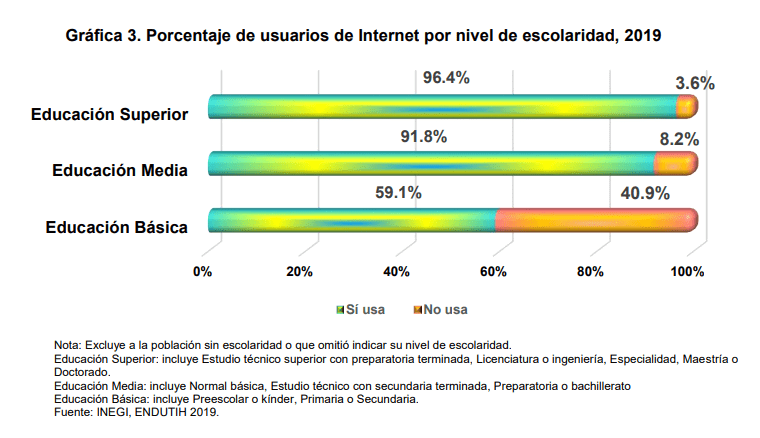 En la gráfica 3, se presenta el porcentaje de usuarios según el último grado de estudios, observando que, a mayor nivel de escolaridad, mayor uso de Internet. Las personas con estudios de nivel superior que no acceden a Internet representan un 3.6%, mientras que las que cuentan con nivel medio representan un 8.2% y para el caso de personas con nivel básico la cifra aumenta a un 40.9 por ciento de no usuarios.