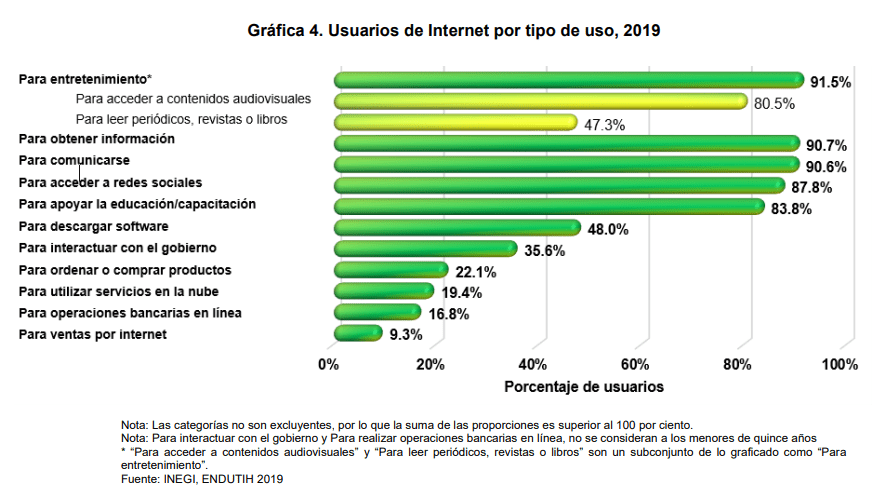 Las principales actividades realizadas en Internet durante 2019 son: para entretenimiento (91.5%), para obtener información (90.7%) y para comunicarse (90.6%)