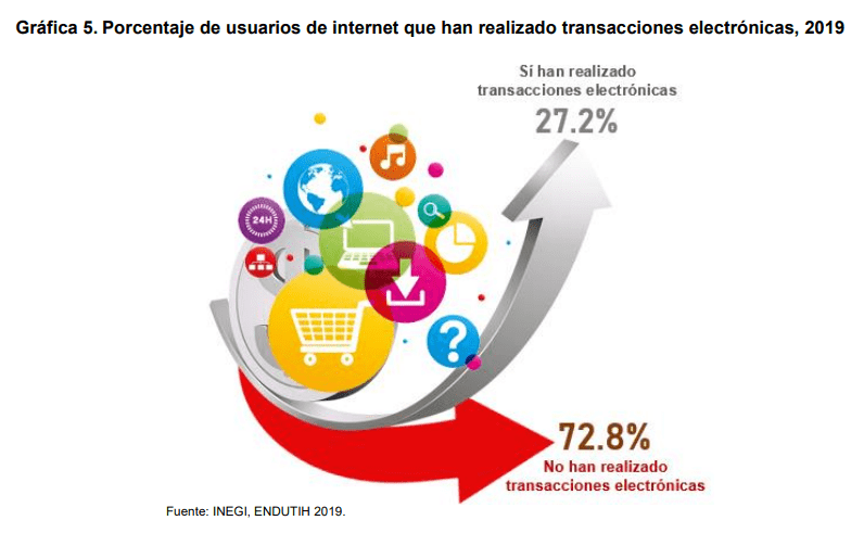 Las transacciones electrónicas, aquellas compras o pagos realizados a través de la red, siguen siendo una actividad poco común entre los usuarios de Internet, reportando en 2019 el 27.2%, proporción que continúa en aumento debido a que en 2018 la participación fue de 23.7 por ciento. (gráfica 5)