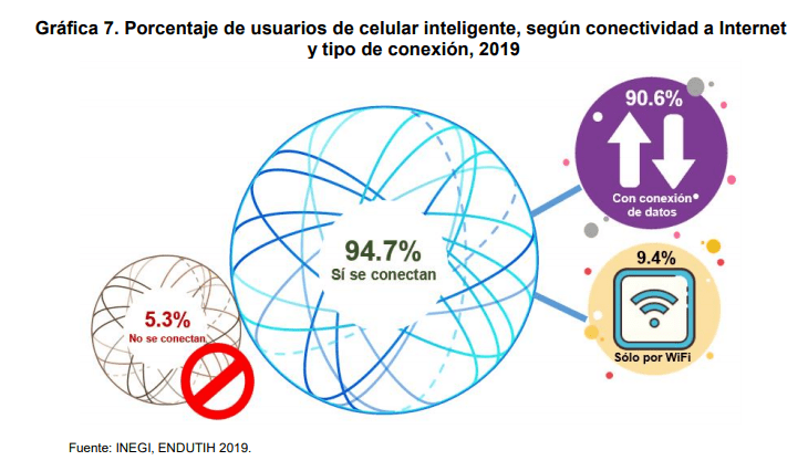 El celular inteligente o Smartphone es capaz de establecer conexión a Internet. Entre la población que dispone de este tipo de celular, el 5.3% no hace uso de la funcionalidad de conexión a la red, mientras que el 94.7% sí lo utiliza; de estos, el 90.6% lo hace a través de una conexión de datos, mientras que el 9.4% de los usuarios lo hacen mediante WiFi.