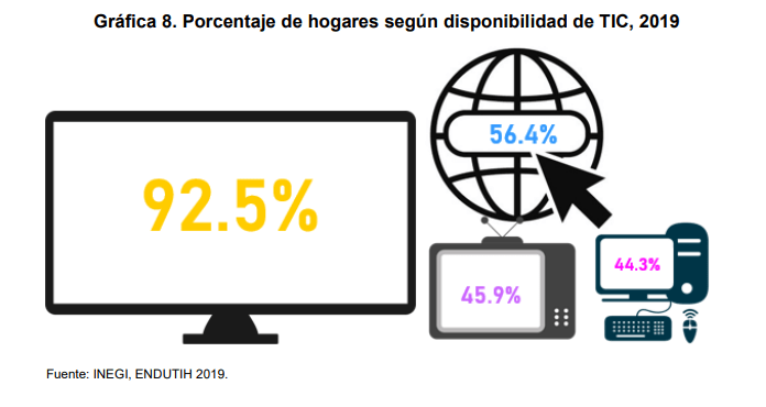 La encuesta capta información sobre la disponibilidad de bienes y servicios TIC en los hogares, destacando aquellos que disponen de televisor con un 92.5%. El 45.9% de los hogares cuentan con servicio de televisión de paga, el 44.3 % disponen de computadora, mientras que los hogares con disponibilidad de Internet registran un 56.4%, lo que corresponde a un incremento del 3.5% respecto al año 2018.