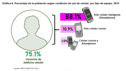 El teléfono celular representa la tecnología con mayor penetración nacional sumando un total de 86.5 millones de personas usuarias en el país. Existen más mujeres (44.7 millones) que usan el teléfono celular que hombres (41.8 millones). Para 2019 se estima que el 75.1% de la población objetivo es usuaria de teléfono celular, de los cuales el 88.1% cuenta con al menos un celular de los llamados teléfonos inteligentes o Smartphone, el 10.9% únicamente cuenta con al menos un celular común y el 1.0% con ambos tipos de celular.