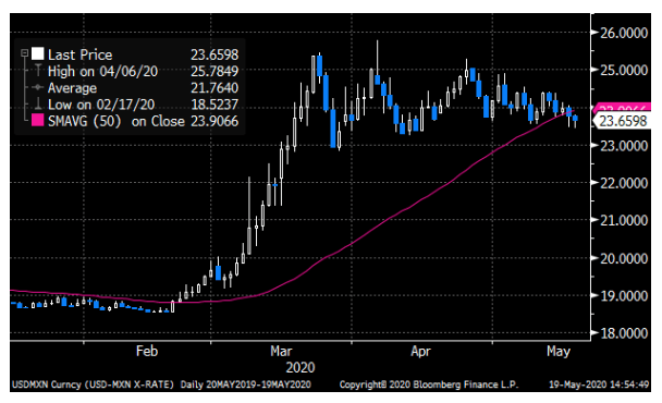El último dato disponible (12 de mayo) muestra que las posiciones netas especulativas a favor del peso están en terreno negativo (5,120 contratos cada uno de 500 mil pesos) por primera vez desde junio 2018.