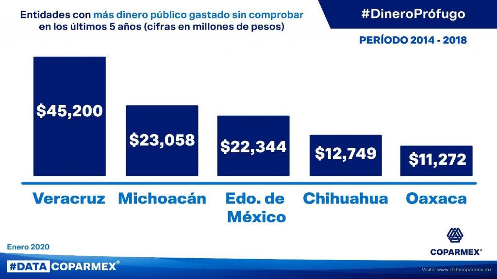 • Las entidades con más dinero público gastado no aclarado en los últimos cinco años son Veracruz (45,200 mdp), Michoacán (23,058 mdp), el Estado de México (22,344 mdp), Chihuahua (12,749 mdp) y Oaxaca (11,272 mdp)