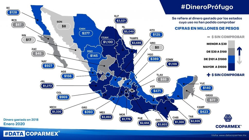 En 2018, la cantidad de dinero que han gastado los estados y que no han podido comprobar aún a petición expresa de la Auditoría Superior de la Federación fue de 36,090 millones de pesos.