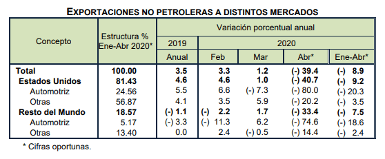 El valor de las exportaciones de mercancías en el cuarto mes de este año fue de 23,385 millones de dólares, monto menor en (-)40.9% al del mismo mes de 2019. Dicha tasa se originó de retrocesos de (-)39.4% en las exportaciones no petroleras y de (-)66.4% en las petroleras. Al interior de las exportaciones no petroleras, las dirigidas a Estados Unidos cayeron (-)40.7% a tasa anual y las canalizadas al resto del mundo (-)33.4 por ciento.