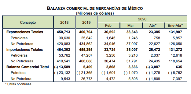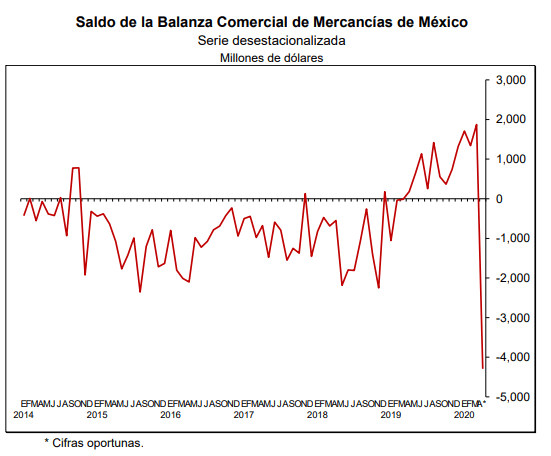 La información oportuna de comercio exterior de abril de 2020 indica que se registró un déficit comercial de (-)3,087 millones de dólares, saldo que se compara con el superávit de 1,510 millones de dólares obtenido en igual mes de 2019. En los primeros cuatro meses de este año, la balanza comercial presentó un superávit de 635 millones de dólares.