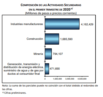 En el trimestre de referencia, el PIB Nominal de las Actividades Secundarias (Minería; Generación, transmisión y distribución de energía eléctrica, suministro de agua y de gas por ductos al consumidor final; Construcción, y las Industrias manufactureras) fue de 7,113,817 mp a precios corrientes, alcanzando 31.6% del PIB a valores básicos.