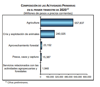 El sector Agricultura, cría y explotación de animales, aprovechamiento forestal, pesca y caza generó 838,349 mp corrientes, monto que significó 3.7% del PIB Nominal a valores básicos en el periodo en consideración.