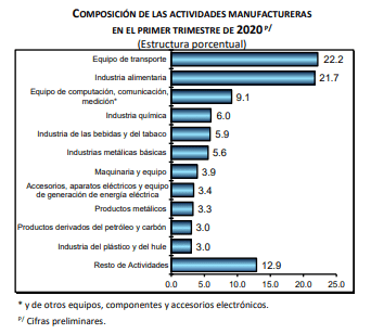 Al interior de las Industrias manufactureras, sobresalió la participación de Fabricación de equipo de transporte y de la Industria alimentaria con el 43.9% de manera conjunta.