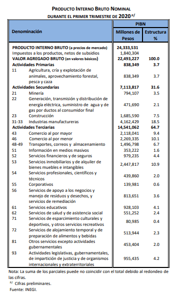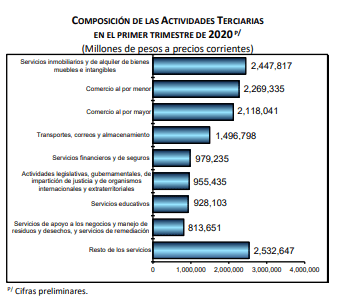 Por lo que respecta al PIB Nominal de los Servicios inmobiliarios y de alquiler de bienes muebles e intangibles, éste fue de 2,447,817  mp y contribuyó al PIB total a valores básicos con 10.9%; el Comercio al menudeo con una cifra de 2,269,335 mp y 10.1%; el correspondiente al Comercio al mayoreo llegó a 2,118,041 mp con el 9.4% y el de Transportes, correos y almacenamiento 1,496,798 mp que aportó 6.7% en el trimestre enero-marzo de 2020.