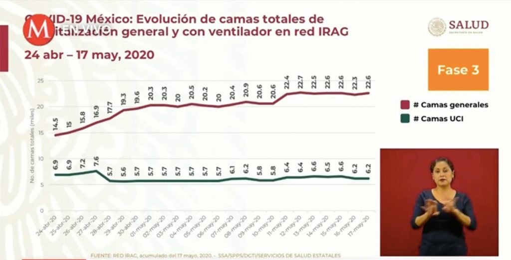 Mientras que los datos de 2019 sólo se nos ofrecen a cuentagotas, el 18 de mayo 2020 el gobierno nuevamente amplió la información sobre capacidades hospitalarias disponibles. En un esfuerzo de comunicación, Hugo López Gatell afirmó que en México se tendían 22,600 CAMAS GENERALES Y 6,200 CAMAS DE CUIDADOS INTENSIVOS con ventiladores funcionando, todas ellas dedicadas a atender a pacientes con Covid-19. Con esto, el mensaje de su jefe, el titular de la Secretaría de Salud fedral, de una semana antes —respecto a que se contaban con 8 mil camas de terapia intensiva con un médico a cargo— quedaba invalidado y hacía parecer aún más lejana la meta de 12 mil camas de terapia intensiva. Aún más preocupante resulta que no sabemos (porque no hay datos) cuántas de las 49 mil camas que reportaban en marzo están funcionando para atender a todo el resto de personas enfermas y accidentadas ¿o es que sólo disminuimos capacidades para reasignarlas a enfermos por Covid-19?