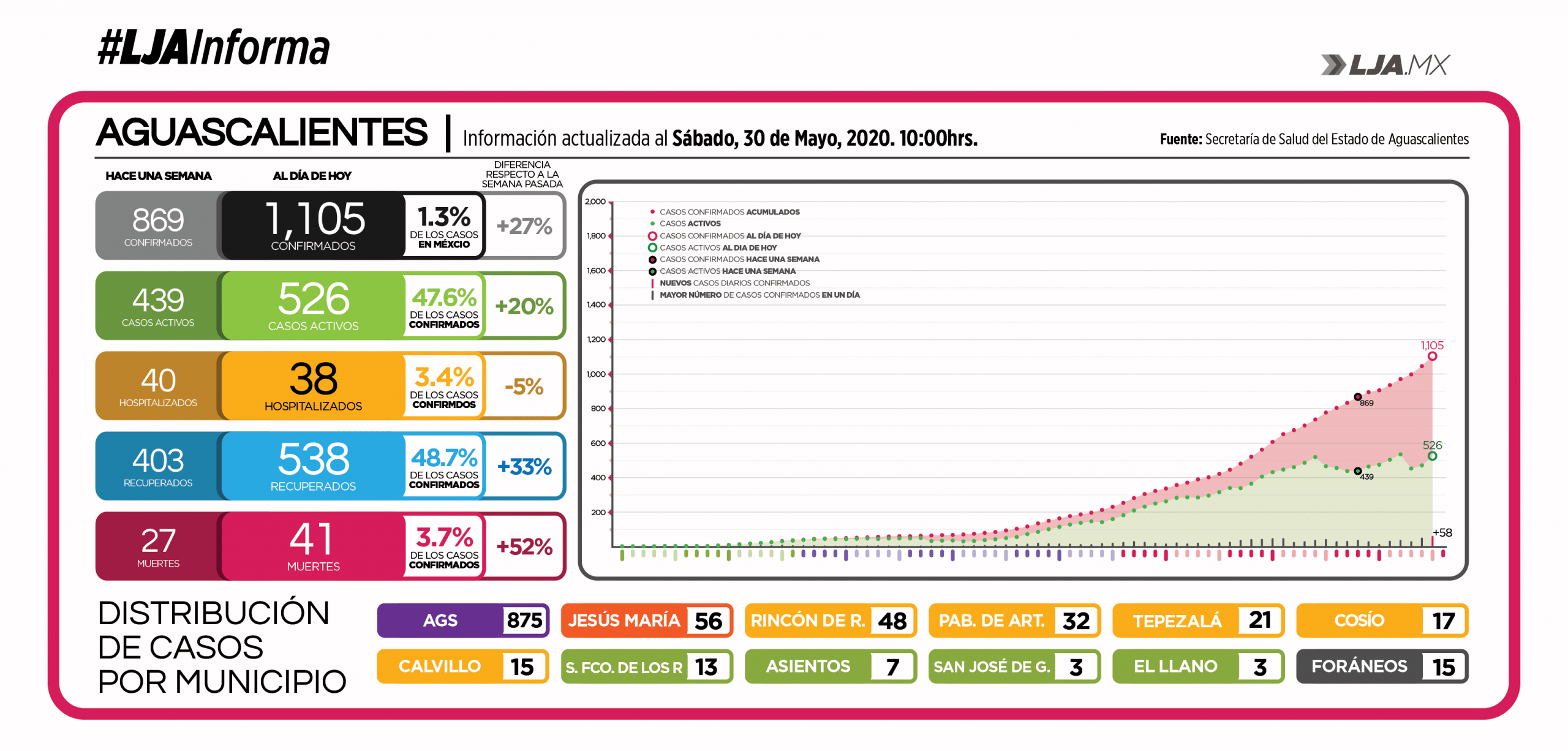 A tan sólo dos días de terminar la Jornada Nacional de Sana Distancia, Aguascalientes muestra un muy importante repunte de casos positivos de COVID-19 sumando 58 nuevos contagios el día de hoy. [mark]Éste es el mayor aumento en el número de casos en la entidad[/mark] desde el inicio de la pandemia y se espera que incrementen aún más dado que el estado aún no llega al punto máximo de contagios, a lo cual se le suma la reapertura de comercios locales, el aumento de la movilidad y el relajamiento de las medidas sanitarias.