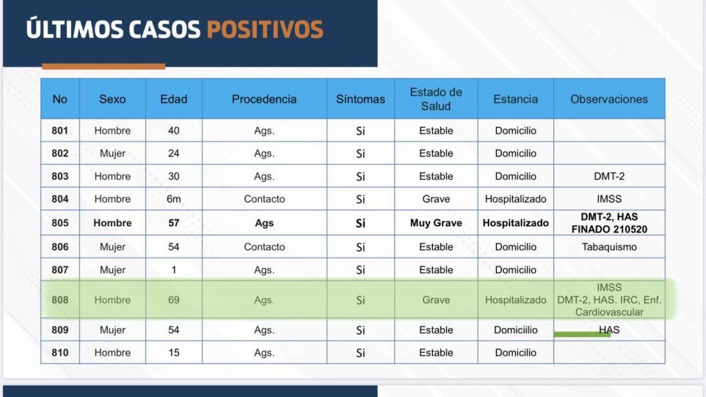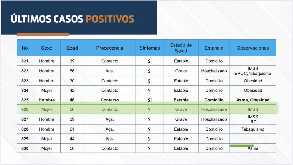 Los casos de hospitalización, si bien han disminuido, esto se debe a que los decesos van en aumentó, sumando cuatro nuevas muertes el día de hoy, colocando ésta como la semana con mayor cantidad de defunciones registradas hasta ahora con un total de 13 muertes. Las últimas cuatro corresponden a una mujer de 56 años, derechohabiente del IMSS, sin comorbilidades registradas; un hombre de 63 años, derechohabiente del ISSSTE con diabetes tipo 2 e Hipertensión; un hombre de 69 años, derechohabiente del IMSS con diabetes tipo 2, hipertensión arterial, Insuficiencia Renal Crónica y enfermedad cardiovascular; y por último un hombre de 71 años, derechohabiente del IMSS, sin comorbilidades registradas.