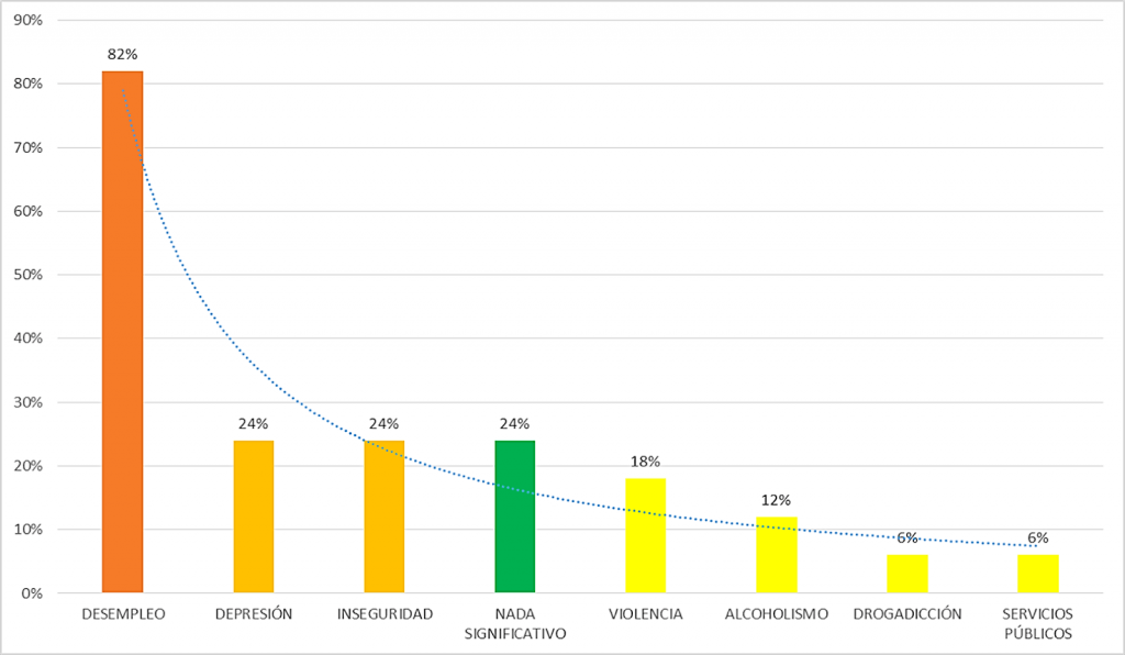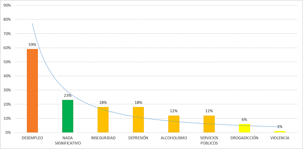 Luego de la aplicación de una encuesta por un observatorio local, tanto en Aguascalientes como en su zona de influencia se pudo apreciar que la principal preocupación de los 500 informantes consultados, durante la contingencia por el Covid -19 es el desempleo, seguido a mitad de porcentaje por la depresión; es menor el problema consignado en materia de inseguridad y carencias de servicios públicos. Sólo el 8% no aprecia que esté pasando algo significativo aunque corresponde a informantes menores y/o adultos mayores.