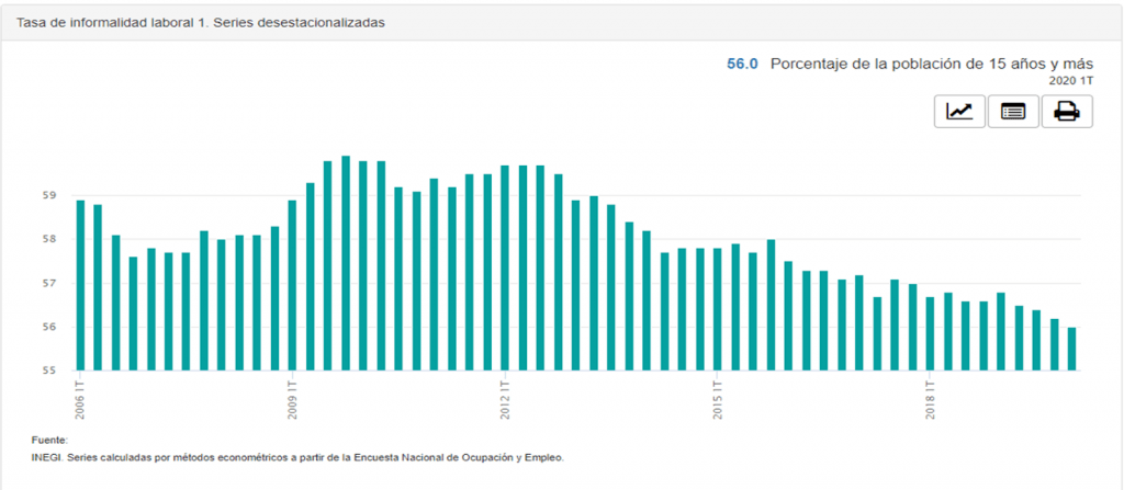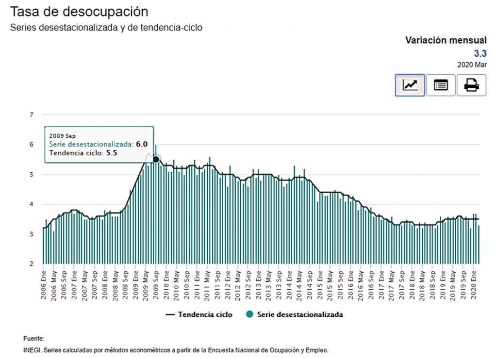 Podemos seguir el comportamiento del desempleo y la economía informal mediante los datos de la tasa de desocupación y la informalidad laboral en las series históricas de la Encuesta de Ocupación y Empleo del INEGI, desde el año 2008, con la aparición de la crisis financiera y su afectación a prácticamente todo el mundo con sus pronósticos sobre el crecimiento de las economías de cada uno de los países y en especial sobre la mexicana, dada la presencia de influenza A/H1N1 que evolucionó desde el pesimismo “optimista” hasta el pesimismo decepcionante, la desocupación regresó a niveles de enero del 2006 hasta enero del 2020 .