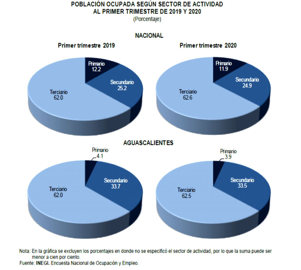 En el primer trimestre de 2020, de la población económicamente activa tanto en la entidad como en la ciudad de Aguascalientes, 96.7% está ocupada. Comparando estos porcentajes con los registrados en el mismo trimestre del año anterior, se observa que el dato de se observa que el dato de ocupación es igual para la entidad y para la ciudad en ambos periodos.