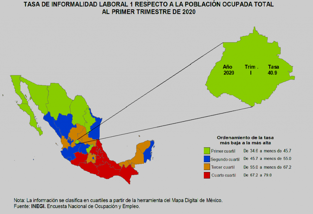 En el primer trimestre de 2020, la tasa de informalidad laboral de Aguascalientes (40.9%) se sitúa en el primer cuartil entre las tasas más bajas, en conjunto con Baja California, Baja California Sur, Sonora, Chihuahua, Coahuila, Nuevo León y Querétaro, estas entidades se ubican en el rango que va de 34.6 a menos de 45.7% respecto al total de la población ocupada. Tasas de informalidad más altas se presentan particularmente en el sur del país, donde se puede llegar a tener de 6 a 8 informales de cada 10 laboralmente ocupados.