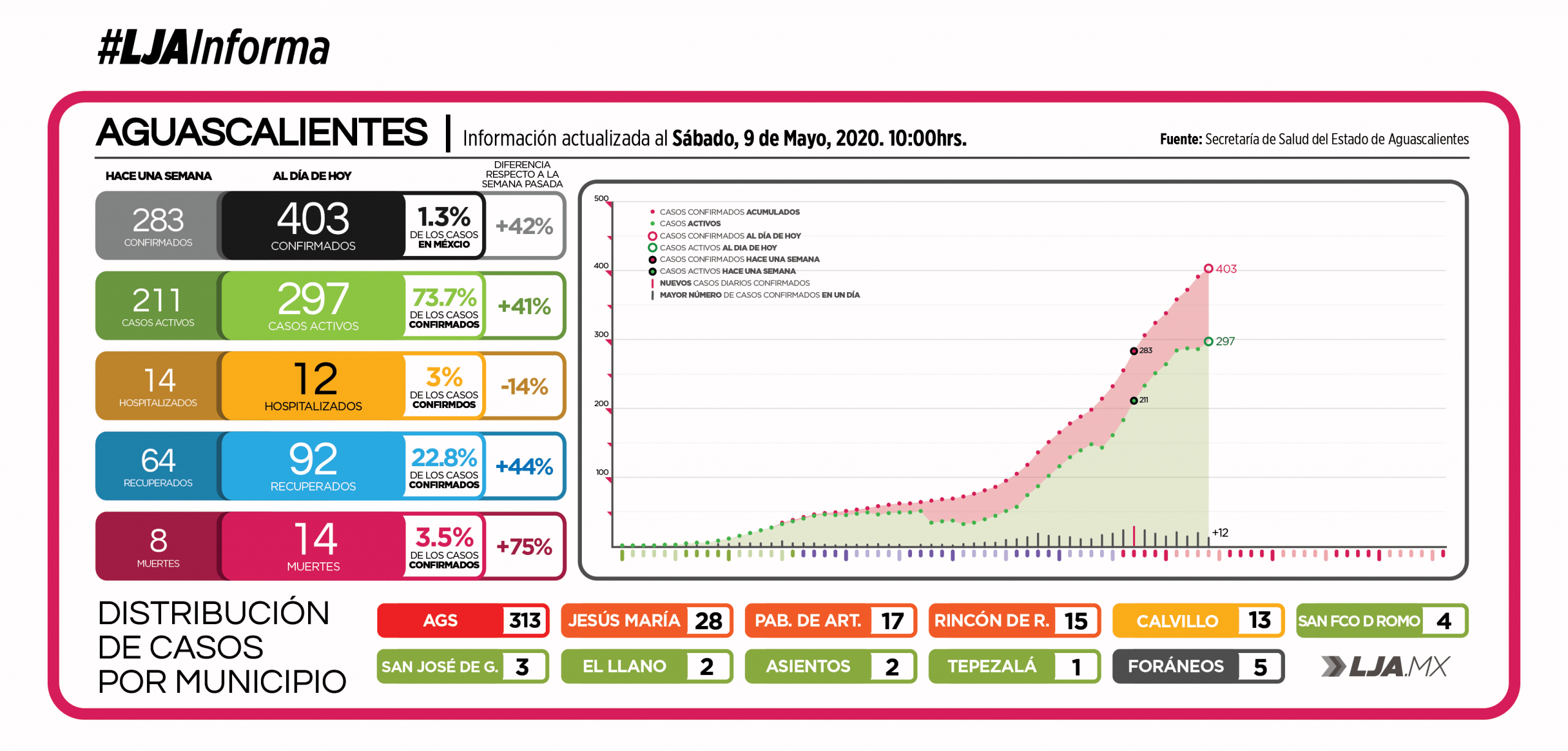 En cuanto a casos confirmados de la enfermedad, hoy se confirman 12 nuevos contagios, alcanzando ya los 403 infectados por SARS-Cov2 en la entidad. De este total, casi el 74% sigue activo, es decir, potencialmente contagioso, del total de casos activos, el 96% (285 pacientes) guardan reposo domiciliario.