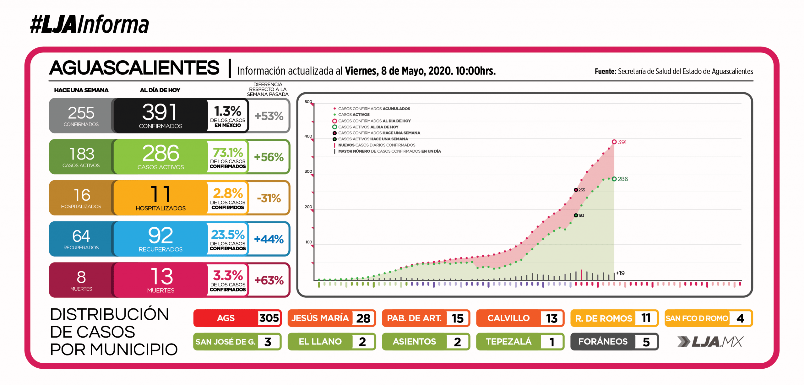 Suman 19 nuevos casos de Covid-19 en Aguascalientes. Son ya 391 casos confirmados.