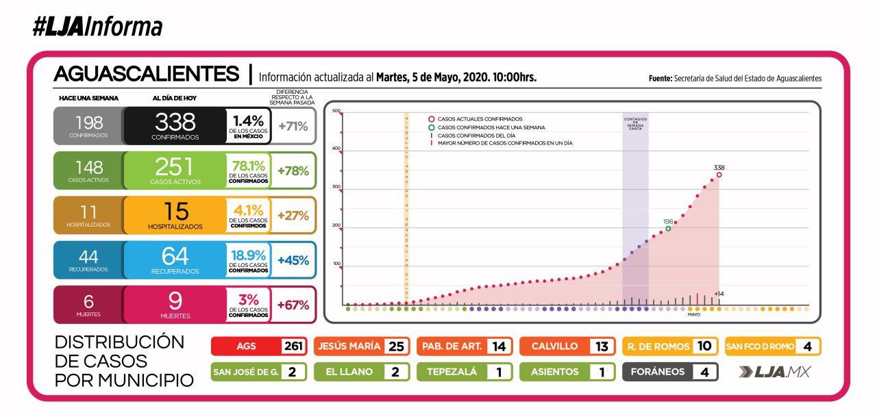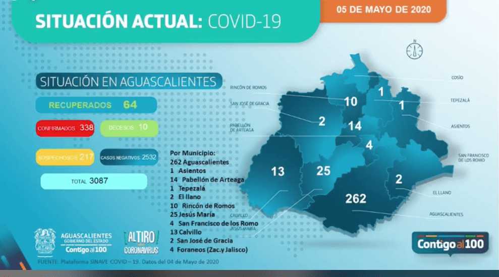 Hoy, Aguascalientes reportó la primer muerte de la semana por Covid-19 sumando ya 10 decesos en la entidad. En cuanto al número de casos, son 14 nuevos casos confirmados de Covid-19 en el estado, alcanzando ya la cifra de 338 contagios en 10 de los 11 municipios de Aguascalientes, destacando la ciudad capital con 262, Jesús María con 25, Pabellón de Arteaga con 14, Calvillo con 13 y Rincón de Romos con 10