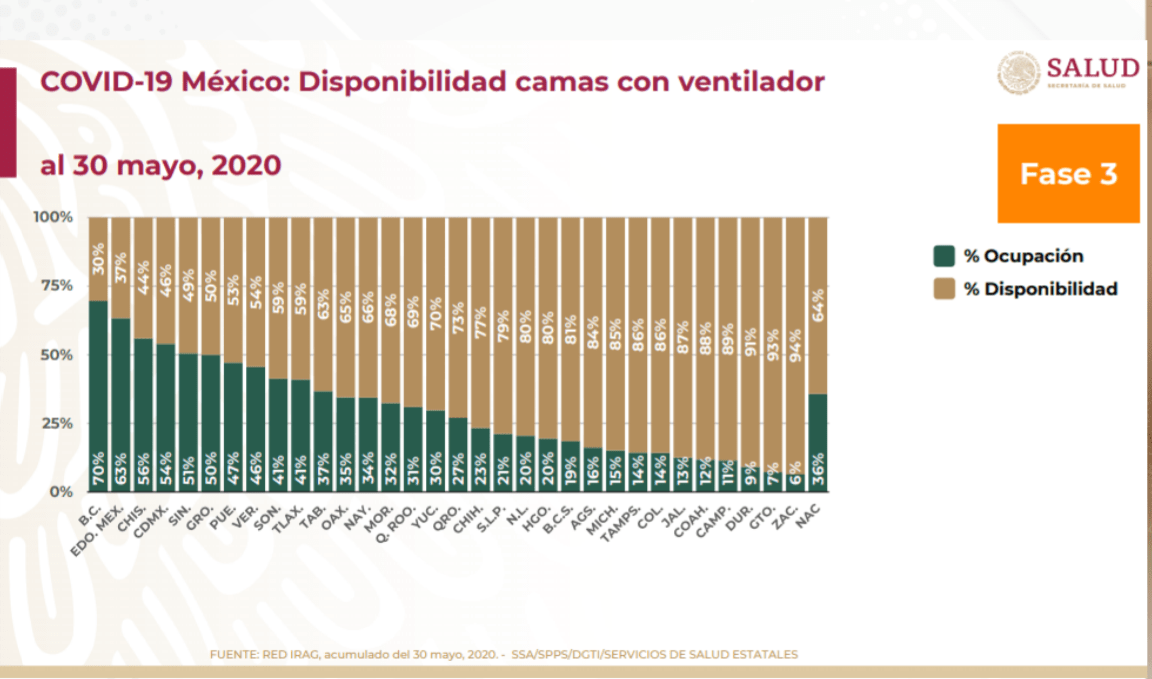 En ocupación de camas con ventilador para pacientes con COVID-19, Aguascalientes cuenta con el 84% disponibles, una cantidad mayor al 64% nacional.