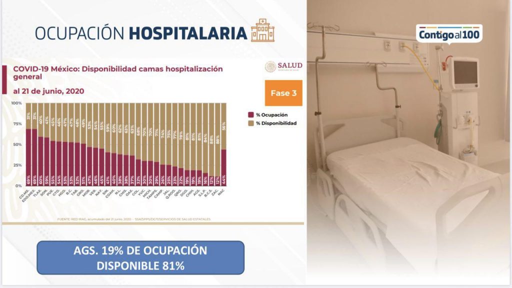 El Instituto Mexicano del Seguro Social es el centro de salud que sigue reportando la mayor carga de hospitalizaciones con un total de 61 camas ocupadas (32 regulares y 29 de terapia intensiva), seguido por el Hospital Miguel Hidalgo con 21 camas (8 regulares y 13 de terapia intensiva) y el ISSSTE con sólo 7 camas (6 regulares y 1 de terapia intensiva). Esto representa, según el reporte de la Secretaría de Salud Nacional, una ocupación hospitalaria del 19% para camas regulares y del 45% para camas de terapia intensiva