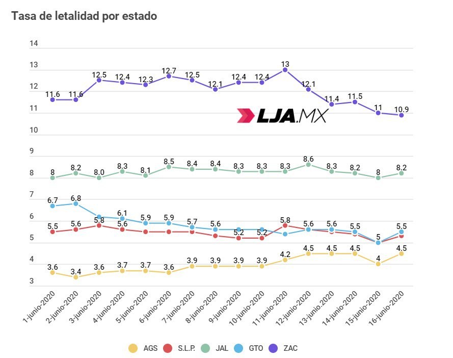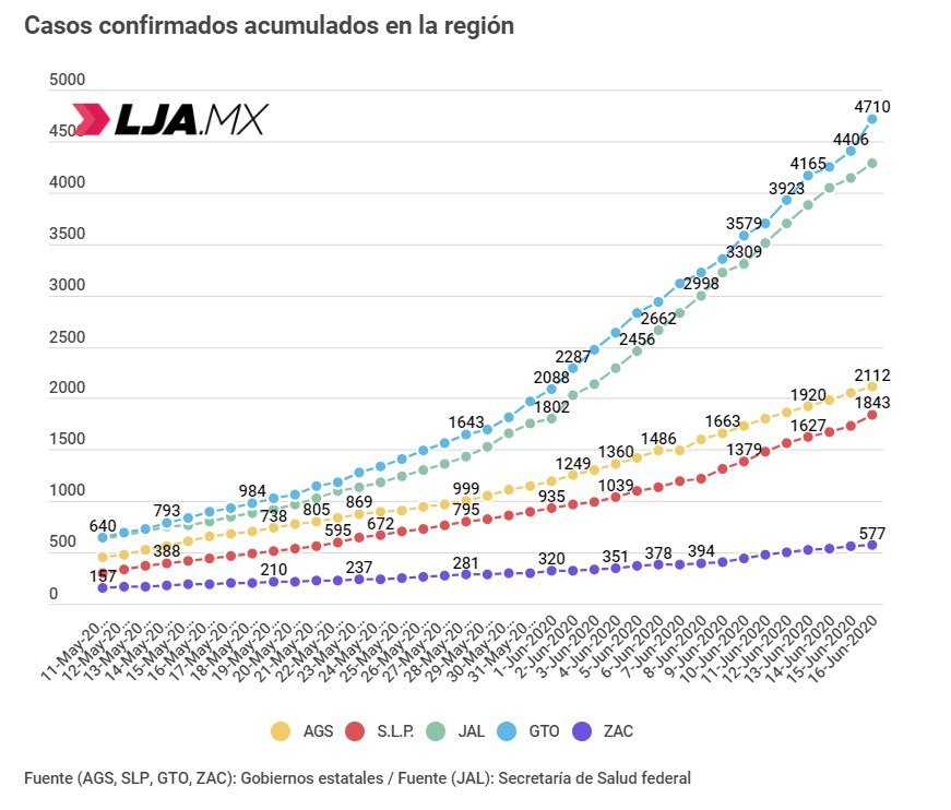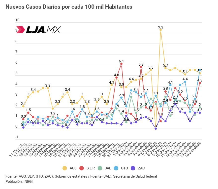 A pesar de escalada de Guanajuato, Aguascaliente sigue en primeros lugares de casos diarios y casos acumulados* de COVID-19, al 16 de Junio