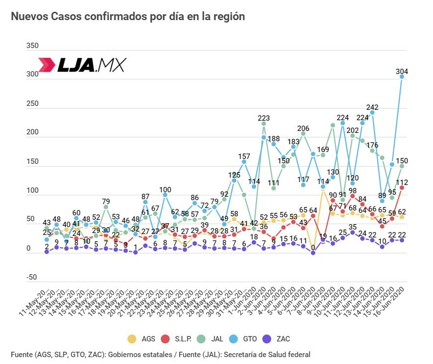 Guanajuato hoy tiene 304 casos nuevos confirmados, llegando a un pico histórico y dejando muy atrás a sus vecinos de la región centro occidente, mientras que Aguascalientes sigue en sus números usuales de estas semanas con 62.