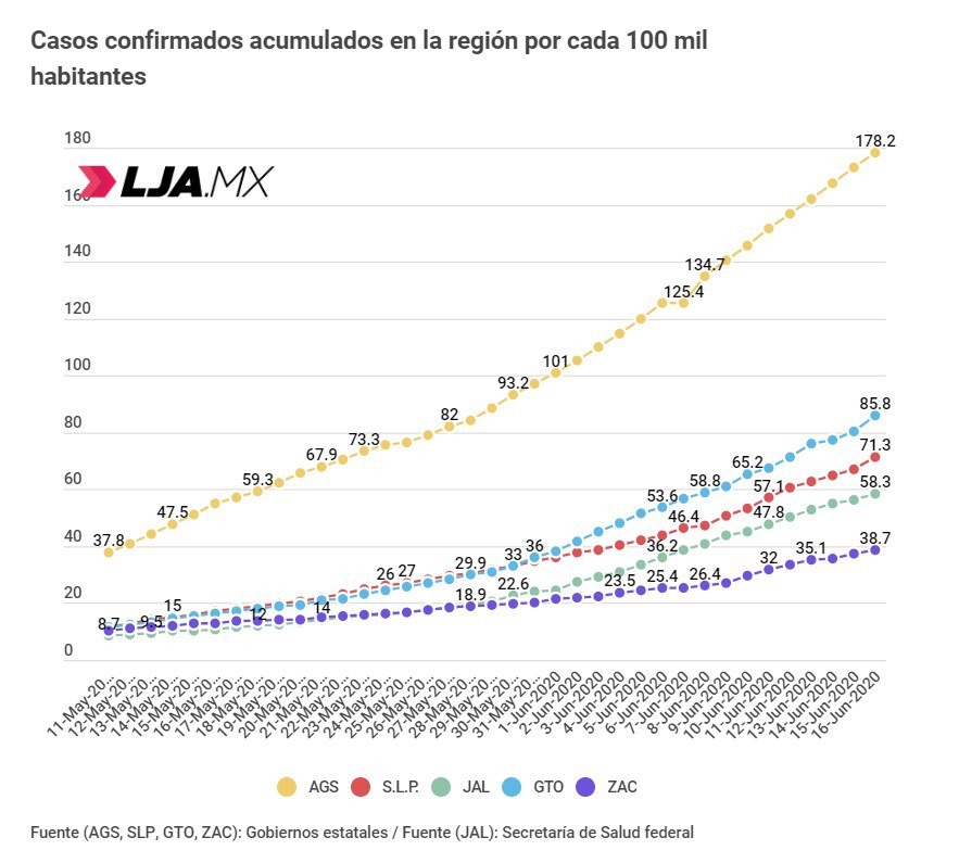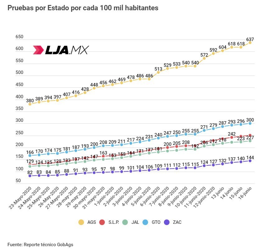 En casos confirmados acumulados, Aguascalientes sigue a la cabeza con 178.2, mientras que Guanajuato tiene 85.8 y San Luis Potosí 71.3. Esto es coherente también con que Aguascalientes es el estado de la zona que MÁS pruebas realiza por cada 100 mil habitantes, hoy con 637, más del doble que Guanajuato.