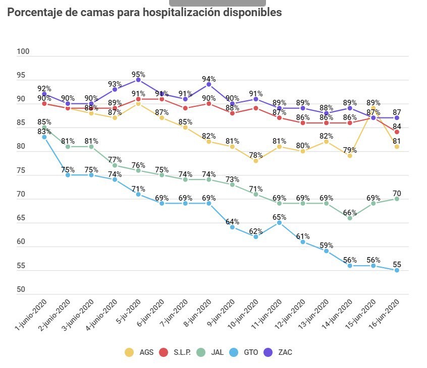 El porcentaje de camas disponibles de Aguascalientes aún es sano con 81% pero en dos semanas bajó 10%, es decir LO MISMO que en toda la Jornada Nacional de Sana Distancia. Aunque eso no llega a niveles de Guanajuato (70%) o Jalisco (55%), que bajaron de los ochentas en los que fluctuaban al triple si lo comparamos con el inicio de la pandemia.