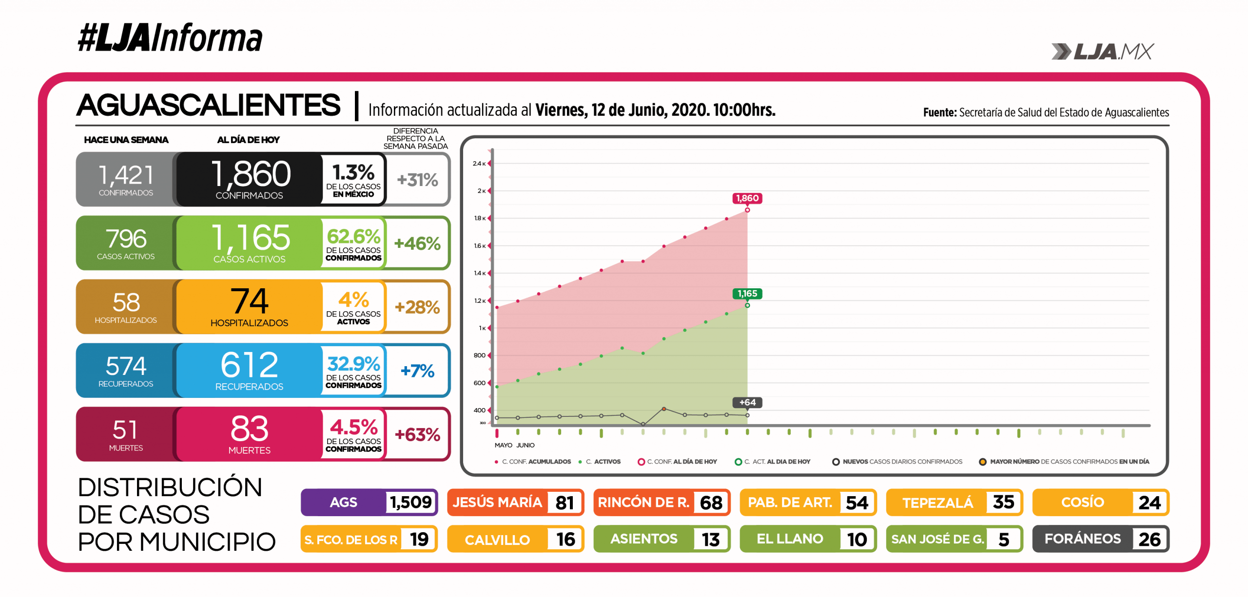 Aguascalientes ha sumado hoy 64 nuevos casos de COVID-19, acumulando ya 374 contagios en los últimos 5 días, superando así el total de infectados de la semana pasada que fueron 335. El estado sigue incrementando su ritmo de contagio sin alcanzar aun la cumbre de la punta epidémica. Al día de hoy ya son mil 860 contagios acumulados, concentrados principalmente en el municipio capital.