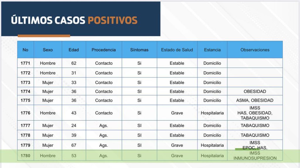 Del total de casos de hospitalización, 40 se reportan en estado grave y 34 en situación crítica, atendidos principalmente por el Instituto Mexicano del Seguro Social, con 56 encamados, seguido por el Hospital Miguel Hidalgo con 15 y el ISSSTE con 3