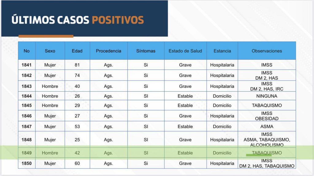 Con las nuevas 3 defunciones confirmadas el día de hoy, la cifra de muertes por COVID-19 en Aguascalientes ascienden ya a 83, lo que representa un aumento del 63% de los casos existentes hace una semana. Los nuevos casos confirmados corresponden a un hombre de 53 años, derechohabiente del IMSS, con inmunosupresión; una mujer de 76 años, derechohabiente del IMSS, con tabaquismo; y un hombre de 42 años, que había sido reportado como estable y con convalecencia domiciliaria, padecía de tabaquismo.