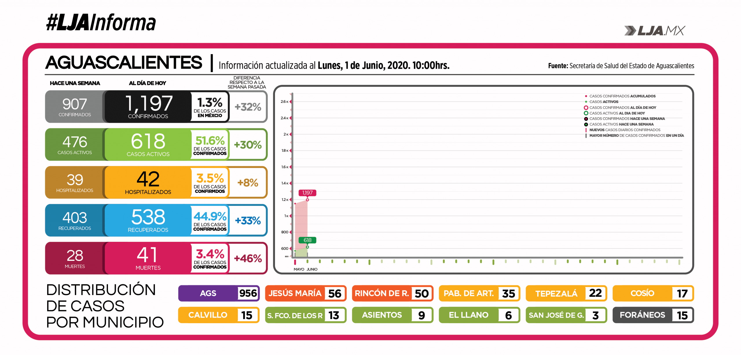 Aguascalientes inicia junio entrando al Semáforo de Riesgo Sanitario en color rojo, es decir, en Máximo Riesgo de contagio, confirmando 46 nuevos casos de COVID-19 en las últimas 24 hrs; Esta es la mayor cifra de nuevos contagios registrados en un sólo día hasta ahora, igualando los casos confirmados el día de ayer.