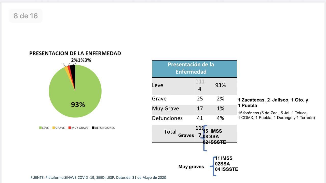La cifra de pacientes hospitalizados se mantiene por arriba de los 40 con un total de 42 casos, 25 reportados como graves y 17 en situación crítica (muy grave), siendo atendidos en su mayoría por el Instituto Mexicano del Seguro Social (26 pacientes hospitalizados), el Hospital Miguel Hidalgo (10 pacientes hospitalizados) y el ISSSTE (6 pacientes hospitalizados)