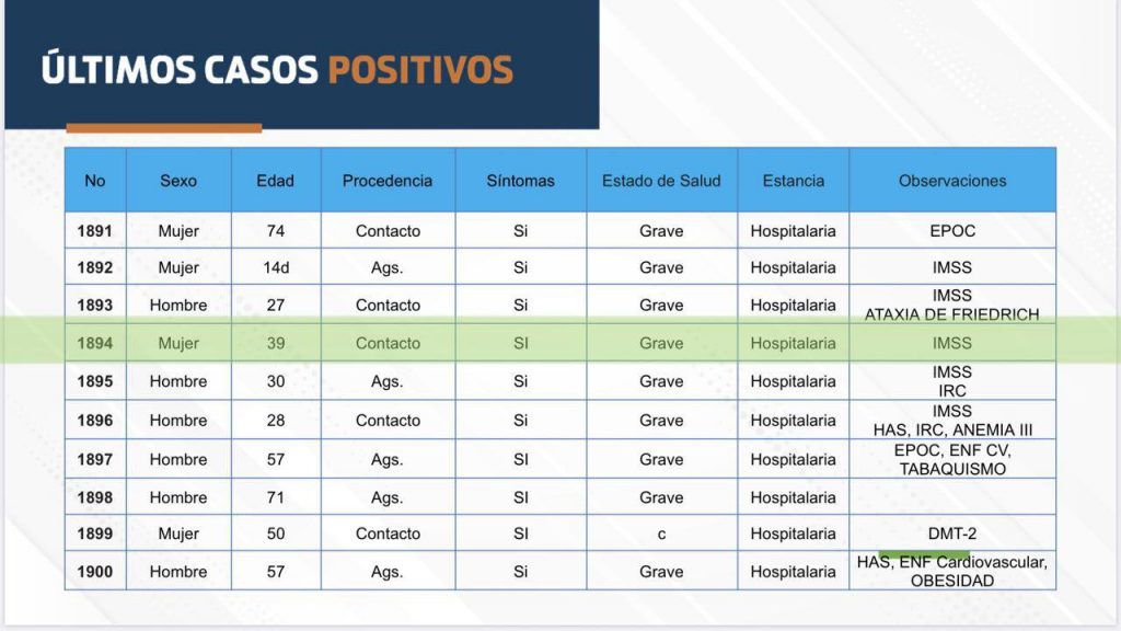 De las 6 nuevas muertes confirmadas en las últimas 24 horas, 4 de los pacientes estaban sanos antes de contraer COVID-19, es decir, no padecían de otro tipo de enfermedades, además de que se registró también el tercer caso de un paciente convaleciente por un mes. Los casos reportados fueron: