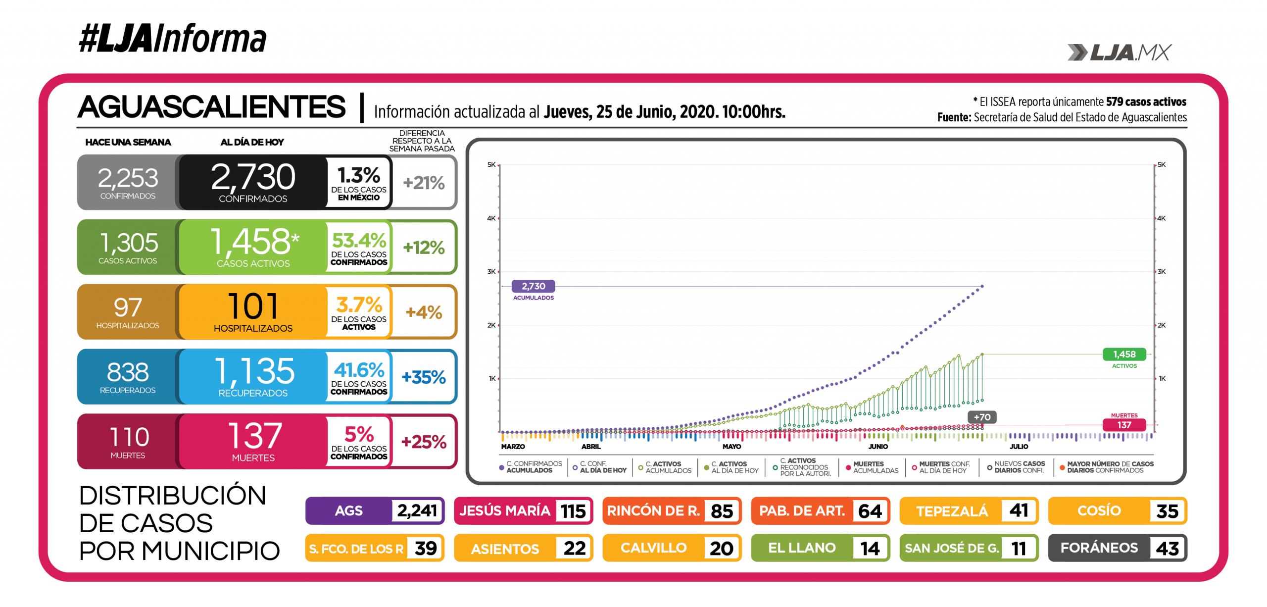 [ev_quote cite=”” align=”left” fontcolor=”#d60057″ bgcolor=”#ffeb3b”]Ya son 4 los casos de pacientes que han muerto pasado un mes de haber contraído COVID-19[/ev_quote]De estos 2 mil 730 casos de pacientes de COVID-19 acumulados en el Estado, el Instituto de Salud del Aguascalientes reporta solamente 598 pacientes activos, mil 135 recuperaciones y 137 decesos, dándonos un total de sólo mil 870 pacientes que cuentan con seguimiento médico, es decir, al día de hoy, hay 860 pacientes de COVID-19 que el ISSEA no reporta dentro de su desglose de casos, desconociendo por completo su estado de salud actual y el estatus del virus en su cuerpo, lo que puede llegar a representar un grave riesgo de contagio.