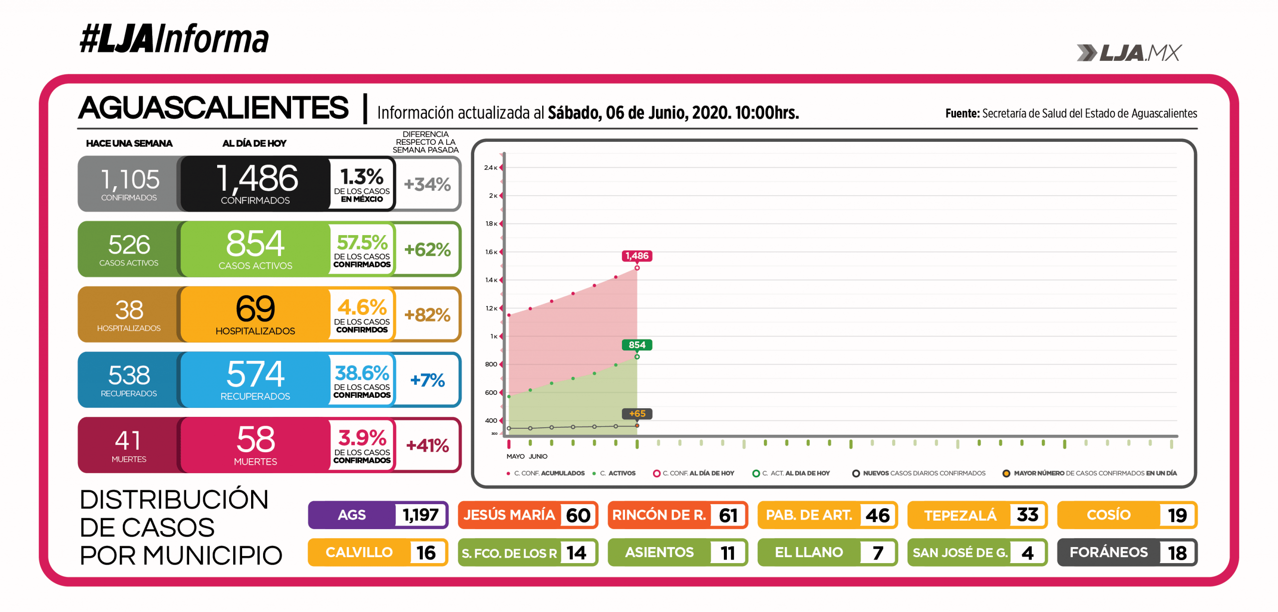 Con 65 nuevos casos y 7 muertes más por COVID-19, Aguascalientes rompe récords de contagios y decesos diarios. Al día de hoy, el estado acumula ya mil 486 personas infectadas con el Coronavirus SARS-Cov2, de los 854 siguen aun con la enfermedad activa, es decir, el 57.5% de los casos aun son potencialmente contagiosos.