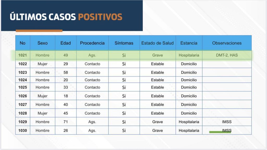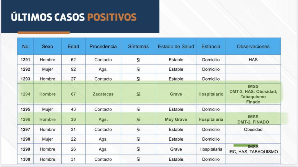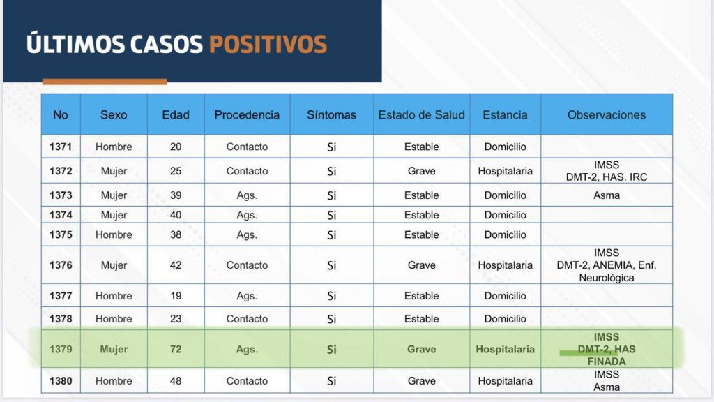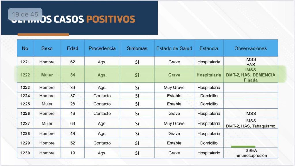 El número de muertes por COVID-19 en Aguascalientes asciende ya a los 58 casos, siendo hoy el día con la mayor cantidad de muertes confirmadas, las 7 nuevas muertes corresponden a: