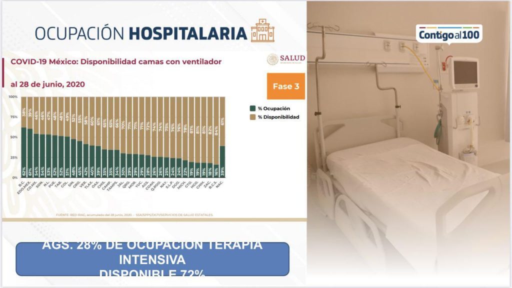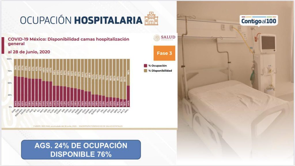 El Instituto Mexicano del Seguro Social es el centro de salud que sigue reportando la mayor carga de hospitalizaciones con un total de 69 camas ocupadas (27 regulares y 42 de terapia intensiva), seguido por el Hospital Miguel Hidalgo con 23 camas (5 regulares y 18 de terapia intensiva) y el ISSSTE con 2 camas de (3 regulares y 2 terapia intensiva). Esto representa, según el reporte de la Secretaría de Salud Nacional, una ocupación hospitalaria del 24% para camas regulares y del 28% para camas de terapia intensiva