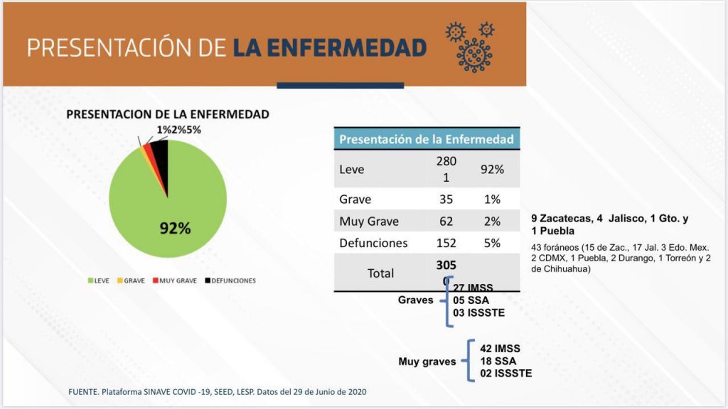 [ev_quote cite=”” align=”left” fontcolor=”#d60057″ bgcolor=”#ffeb3b”]Ya son 4 los casos de pacientes que han muerto pasado un mes de haber contraído COVID-19[/ev_quote]De estos 3 mil 50 casos de pacientes de COVID-19 acumulados en el Estado, el Instituto de Salud del Aguascalientes reporta solamente 626 pacientes activos, mil 579 recuperaciones y 152 decesos, dándonos un total de sólo 2 mil 357 pacientes que cuentan con seguimiento médico, es decir, al día de hoy, hay 693 pacientes de COVID-19 que el ISSEA no reporta dentro de su desglose de casos, desconociendo por completo su estado de salud actual y el estatus del virus en su cuerpo, lo que puede llegar a representar un grave riesgo de contagio.